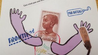 Guidés par l'intervenant, les jeunes visiteurs créent une Marianne, celle des timbres Poste, de la tête aux pieds, et l'habillent de mots et d'accessoires glanés dans les collections du Musée de l'histoire de l'immigration.