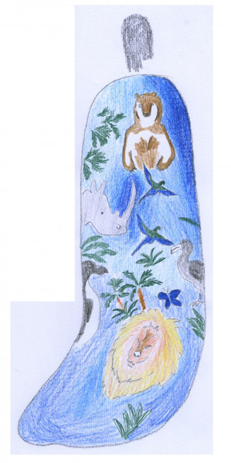 En hommage à ces espèces, un homme traine lourdement cette cape comme un fardeau, ornée de ces animaux, à la fois emblèmes et victimes.