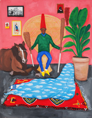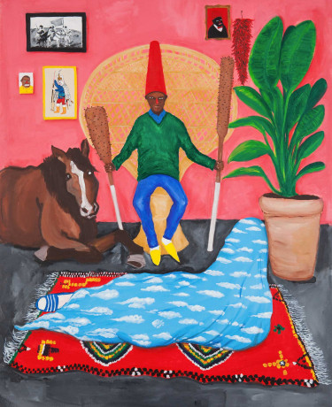 Sa double culture, marocaine et espagnole, lui permet d’introduire dans son travail des références à l’Orient et à l’Occident. Trophy Room réinterprète une célèbre image de Huey Percy Newton, leader et fondateur du mouvement Black Panther Party. L’artiste entremêle des symboles soufis traditionnels (bonnet conique de derviche, tapis rouge) avec une iconographie orientaliste, tel le janissaire Ottoman ou le piment séché et des références à la culture occidentale avec le polo Lacoste. Avec ironie, il s’amuse de ces symboles, à l’instar du Pur-sang arabe qui semble avoir perdu de sa superbe. Si certaines métaphores sont déchiffrables, l’artiste brouille les pistes en créant un univers enchevêtré entre réalité et fiction, pour « désorientaliser l’image de l’Orient ». Dans cette salle des trophées sans trophées, l’artiste peint un cadre spatio-temporel impossible à définir.