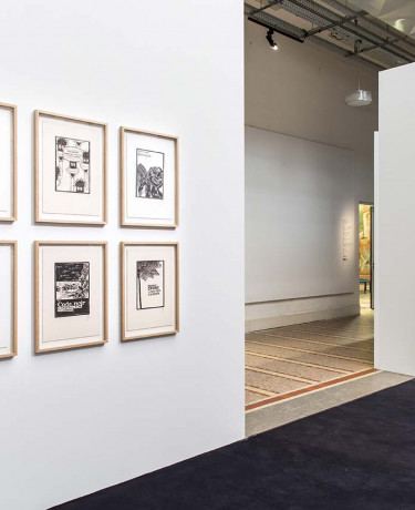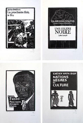 Salesman of Revolt, issue d’une collaboration pendant une résidence à Bombay, avec l’artiste indienne Tejswini Sonawane, s’intéresse à l’impact des luttes raciales dans les sociétés occidentales. Cette série de gravures rend hommage à de jeunes marchands ambulants portant sur leur tête, sur les marchés de Dakar, des piles de livres à vendre. Parmi ces ouvrages, l’artiste sélectionne ceux, incontournables, de James Baldwin, Ta-Nehisi Coates ou Cheikh Anta Diop qui questionnent les conséquences du racisme et du colonialisme. Ces jeunes vendeurs, pour la plupart analphabètes, portent tels des totems, toute la force et le poids historique de ces ouvrages. Sans en connaître forcément le contenu, ils se laissent guider, comme par intuition, par la couverture choisie par les éditeurs. Si l’artiste s’intéresse autant aux titres qu’à leurs auteurs, il s’attache également au choix du visuel de couverture, qu’il reproduit en gravure.