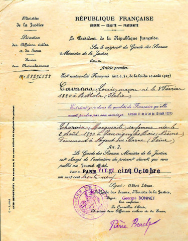 Décret de naturalisation de Luigi Cavanna et de sa femme née Marguerite Charvin © Musée national de l'histoire et des cultures de l'immigration