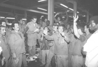 Grève des ouvriers de l'usine Simca de Poissy, 1983, Poissy, tirage noir et blanc Fine Art, 30 cm x 40 cm, Musée national de l'histoire de l'immigration, inv. 2007.13.1