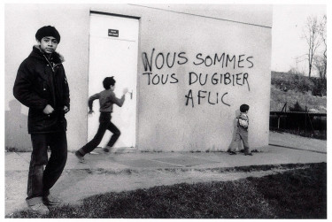 Amadou Gaye, Nous sommes tous du gibier à flics, cité de transit de la Butte Rouge Chatenay-Malabry, 1988, Musée national de l’histoire de l’immigration, inv. 2018.106.1