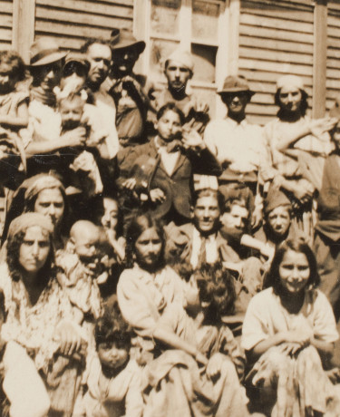 Auteur inconnu, Un groupe de Nomades détenus au camp de Linas-Montlhéry, entre novembre 1940 et avril 1942, tirage d’époque 9 x 6 cm, © Collection privée – Reproduction : B. Huet / Tutti-image
