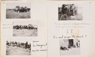Friedel Bohny Reiter, Vues du camp de Rivesaltes et portraits d’internés, double page issu de l’album photographique De mon travail au camp de Rivesaltes, 12 novembre 1941 - 25 novembre 1942, montage de tirages collés sur papier, formats divers, 19,5 × 31 × 3,5 cm, anonyme © Eidgenössische Technische Hochschule Zürich, Archiv für Zeitgeschichte, NL Friedel Bohny-Reiter/12