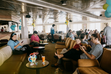 À bord du ferry « Méditerranée » de la Corsica Linea, mai 2022 (reportage photographique de Sandra Mehl). Le ferry qui dessert habituellement la ligne Marseille-Alger a été transformé en un centre d'accueil pour les réfugiés ukrainiens. À quai dans le port de Marseille, il accueille à bord près de 930 personnes. Doté de 500 cabines, il offre une solution d'hébergement, de restauration mais également un accompagnement social, médical et une aide à l'emploi.