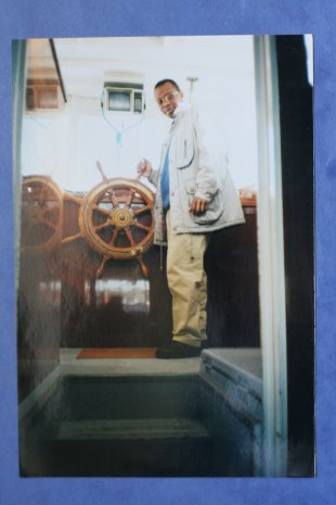 Houssen Mze Hamadi, archives. Houssen posant dans un bateau « pour les touristes » au Vieux-Port, peu de temps après son arrivée (années 96-97, il ne se souvient pas) © Collection particulière Houssen Mze Hamadi, Atelier du Bruit.