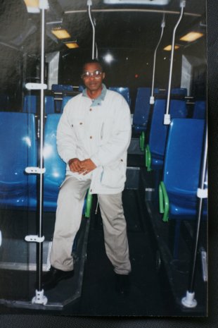 Houssen Mze Hamadi, archive. Houssen posant peu après son arrivée (il ne se souvient pas des dates exactes, mais vers 1996-97, sa période de clandestinité) dans un autobus de la RTM © Collection particulière Houssen Mze Hamadi, Atelier du Bruit.
