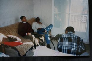 Houssen Mze Hamadi, archive. Houssen, de dos, avec deux de ses amis des Comores, fin des années 97, chez sa sœur à Marseille © Collection particulière Houssen Mze Hamadi, Atelier du Bruit.