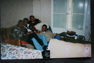 Houssen Mze Hamadi, archive. Houssen, le premier sur la gauche avec ses amis de jeunesse des Comores, fin des années 97, chez sa sœur à Marseille © Collection particulière Houssen Mze Hamadi, Atelier du Bruit.