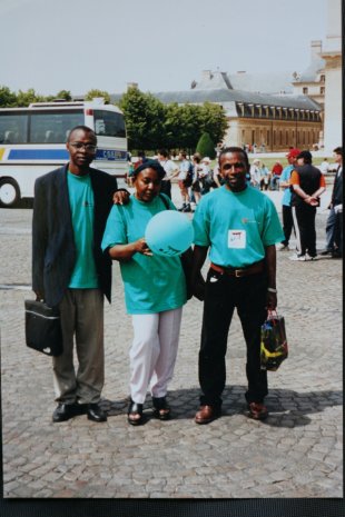 Houssen Mze Hamadi, archives. Avec deux compatriotes comoriens de la Coordination, lors d’un meeting à Narbonne, 1998 © Collection particulière Houssen Mze Hamadi, Atelier du Bruit.