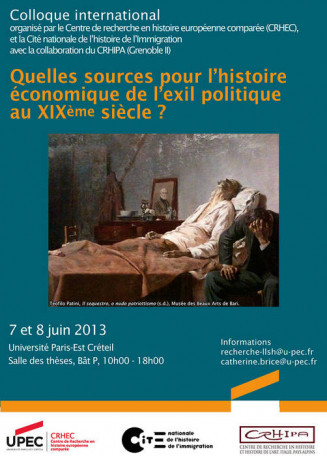 La table ronde organisée les 7 et 8 juin 2013, autour des sources d’une histoire économique de l’exil politique au XIXème siècle, constitue le premier volet de ce projet. Il s’agira d’abord de comprendre quelles sources permettent de repérer les exilés dans la masse des migrants qui parcourent l’Europe du 19ème siècle, alors que la catégorie d’exilé politique apparaît tardivement. La réflexion permettra également de recenser les sources qui peuvent être utilisées pour saisir leurs parcours économiques et sociaux dans les pays de départ et d’accueil.