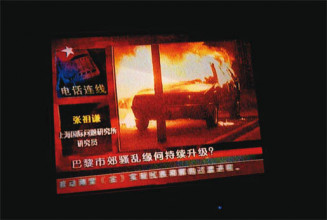Journal télévisé de la CCTV chinoise sur les émeutes des banlieues en France- Shanghai, Chine, 2005 © Patrick Zachmann, Magnum Photos